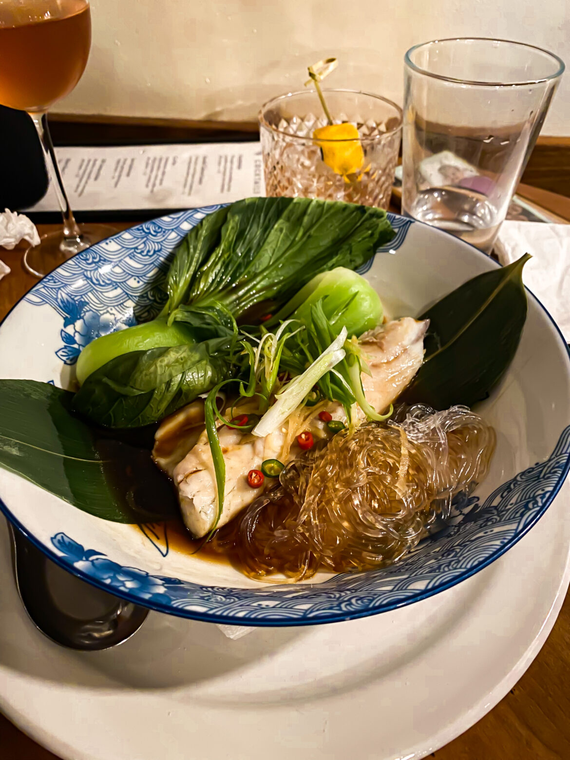 Drooled over all the food choices but finally narrowed it down to the lemongrass pork skewers with house fish sauce, some kind of amazing fried shrimp balls, and Vietnamse pork sausage. Then, the steamed branzino with soy ginger sauce, glass noodles, and greens, OMG. It was BEAUTIFUL. Perfectly seasoned without overwhelming the delicate fish and such an explosion of flavors. I’ll be thinking of this dish for a long time.